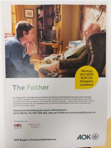 The Father“ gezeigt. Im Vorfeld und im Nachgang stehen Pflegeberaterinnen der AOK und aus dem Pflegestützpunkt zur Verfügung für alle Fragen rund um das Thema Demenz und Pflege.